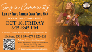 We will be led by Faye Adinda, a heart centered songleader, performing artist, & community event organizer. She is passionate in helping people open their voices, find self-empowerment & healing, inspire community building, and for each person to step into unique expressions & gifts. Faye has been performing for over 15 years and has been leading song circles over 9 years. She is also the founder and head organizer of “Singing In Love”, a 4 day singing gathering in the Poconos.